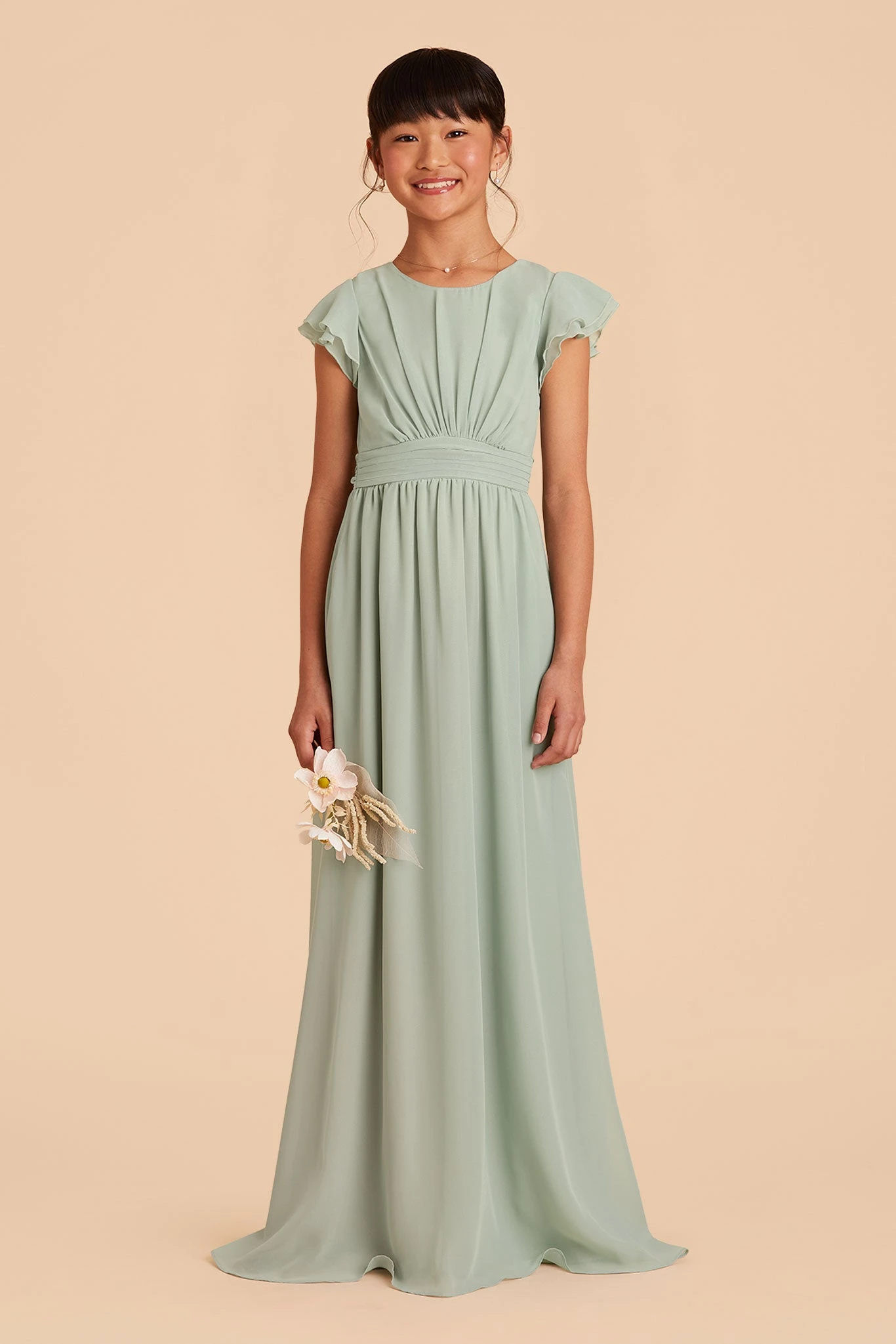 This sweet ruffle-sleeved dress is a dream for a junior bridesmaid. This design features a waistband tie in back for juniors who are between sizes.