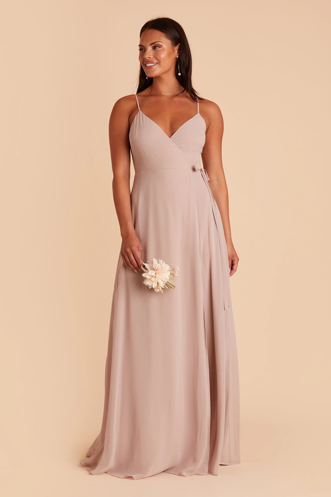 Let’s wrap up the search—this dress is the one. Your girls will thank you for choosing such a figure-flattering full skirt with a waist-cinching bodice sure to look graceful on every body. Speaking of flattering, the signature wrap style draping across the chest for a classic V-neckline plus a matching V in the back draws you in from every angle. Don’t worry, the dainty side bow that keeps this whole thing together has hidden extra security underneath the dress so that the only flashing on the big day will be your crew’s surprise flash dance.