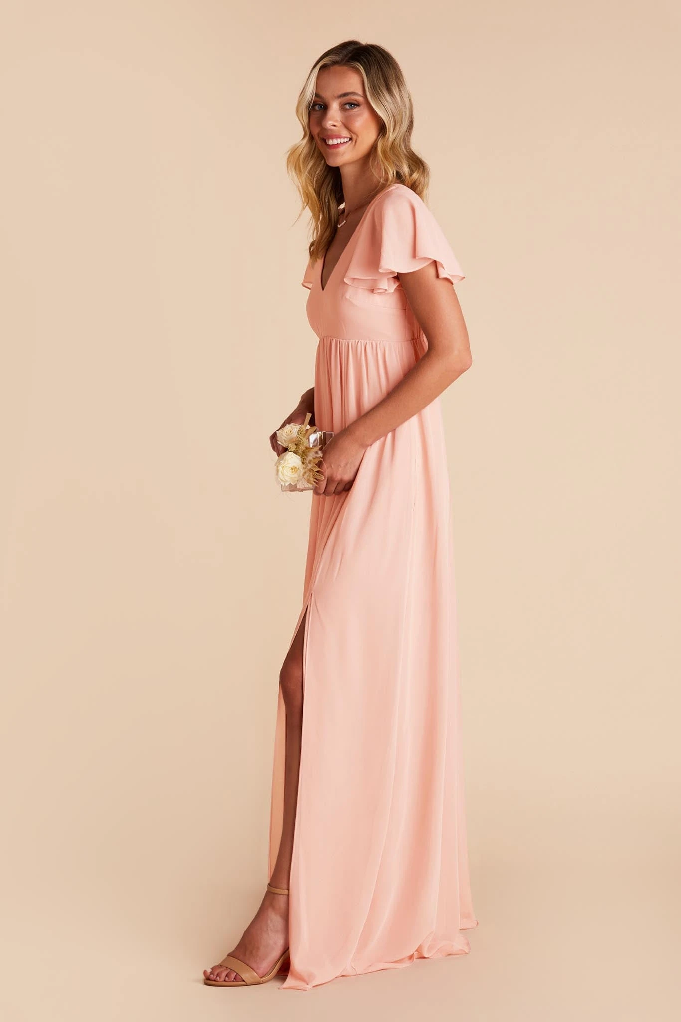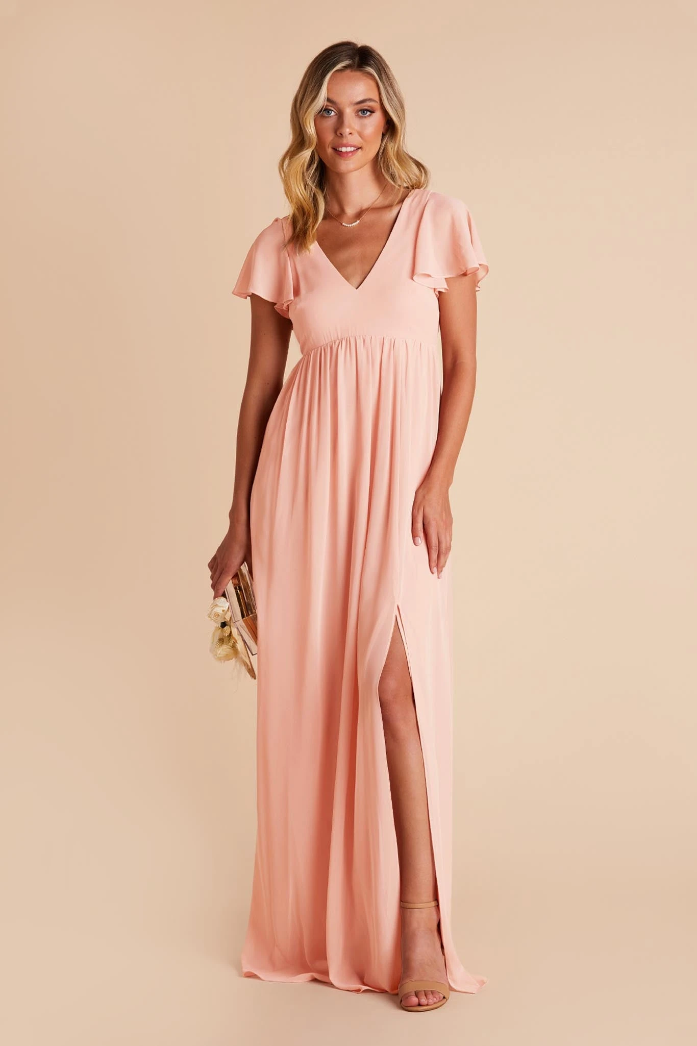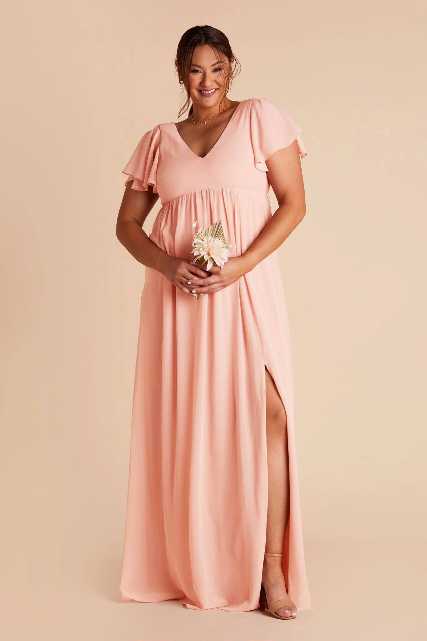 Whatever you need that extra wiggle room for—a baby bump, a second helping, extra cake, or if you simply prefer more breathing room, Hannah is the girl for you. Spun of lightweight chiffon, this dress won’t ever weigh you down while floating down the aisle or getting down on the dancefloor (no one said a bump should keep you from having fun!). The key here is the raised empire waist fitted with a stretchy elastic that’s especially great news for expecting moms. The flutter sleeves add a sweet touch while also offering comfy arm coverage.