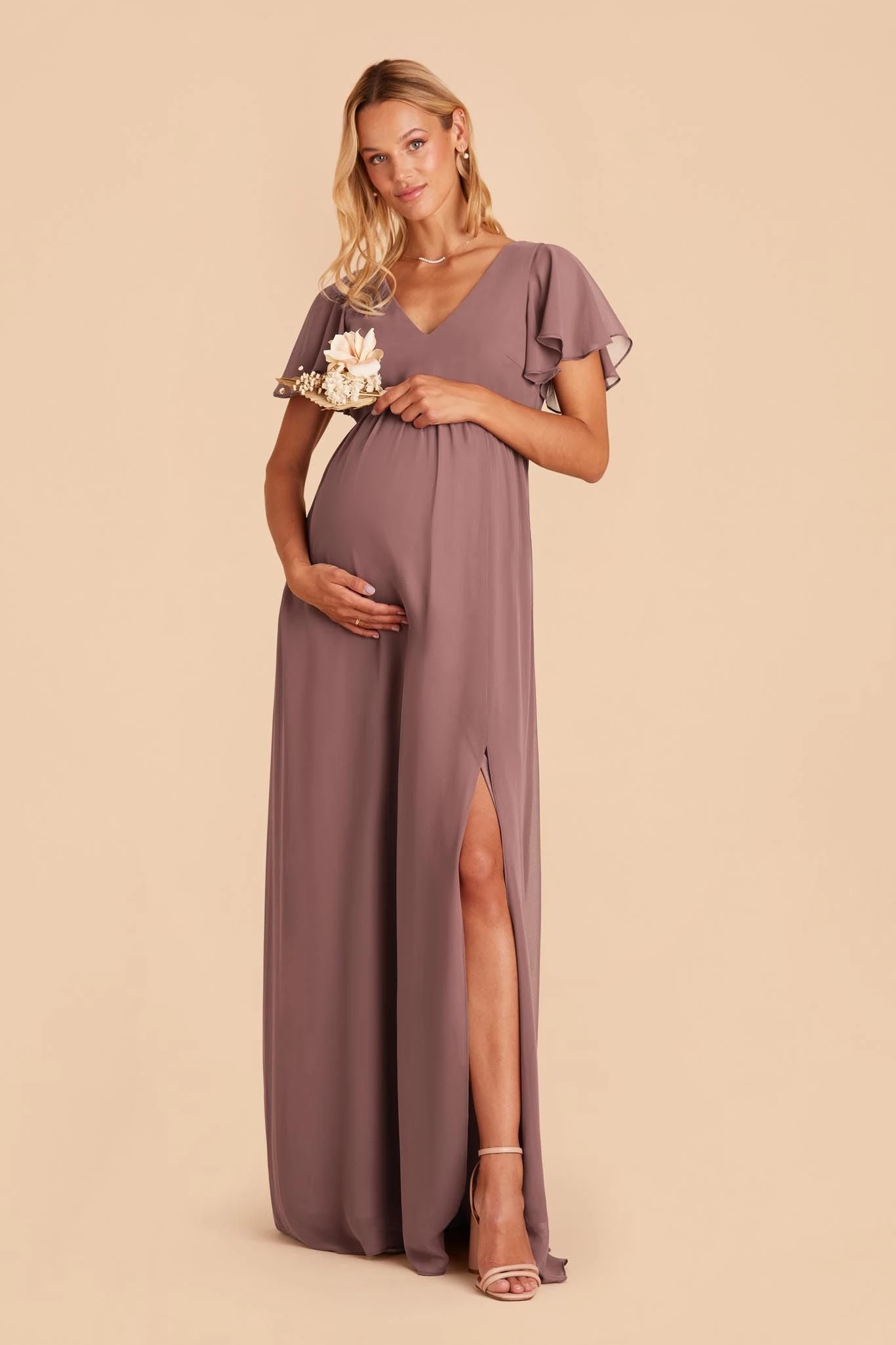 Whatever you need that extra wiggle room for—a baby bump, a second helping, extra cake, or if you simply prefer more breathing room, Hannah is the girl for you. Spun of lightweight chiffon, this dress won’t ever weigh you down while floating down the aisle or getting down on the dancefloor (no one said a bump should keep you from having fun!). The key here is the raised empire waist fitted with a stretchy elastic that’s especially great news for expecting moms. The flutter sleeves add a sweet touch while also offering comfy arm coverage.