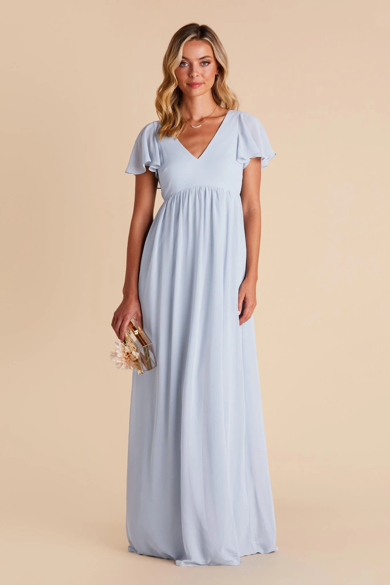 Whatever you need that extra wiggle room for—a baby bump, a second helping, extra cake, or if you simply prefer more breathing room, Hannah is the girl for you. Spun of lightweight chiffon, this dress won’t ever weigh you down while floating down the aisle or getting down on the dancefloor (no one said a bump should keep you from having fun!). The key here is the raised empire waist fitted with a stretchy elastic that’s especially great news for expecting moms. The flutter sleeves add a sweet touch while also offering comfy arm coverage.