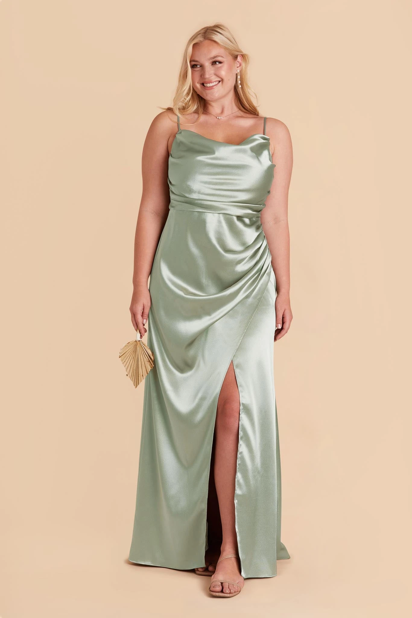 If our Lisa Satin Midi is the young, fun-loving sister, this floor-length one is the elegant, grown-up sis. She still flaunts the same signature ’90s cowl neck, but this Lisa is a head-turning statuesque beauty. We see this satin bridesmaid dress paired with a chic little clutch, and a dainty pearl necklace to accentuate your collarbone.