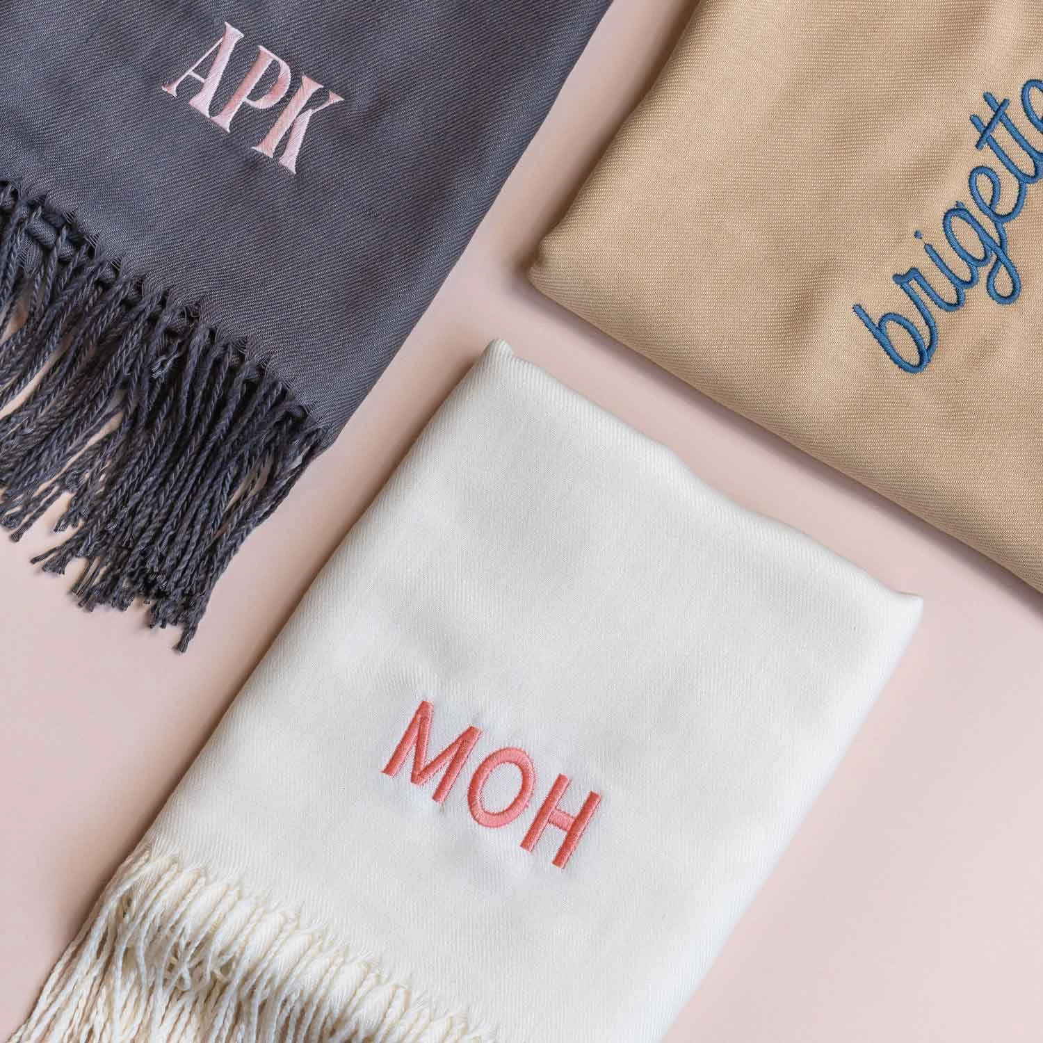 Please note, the live preview of the personalization appears on a folded shawl. The embroidery is aligned on the right side of the garment, not in the center.
