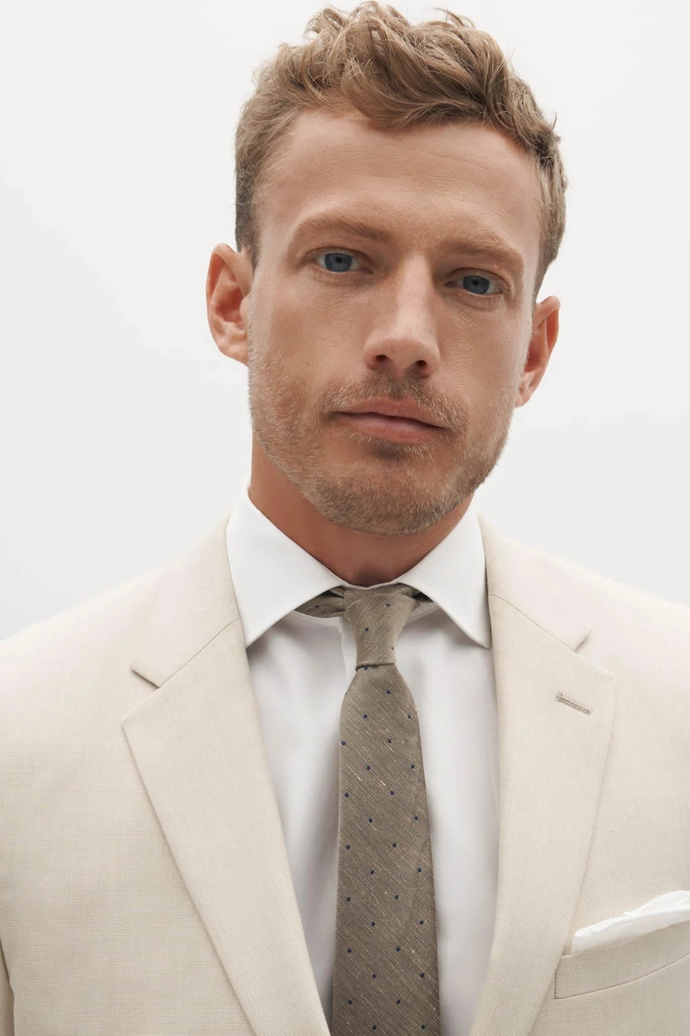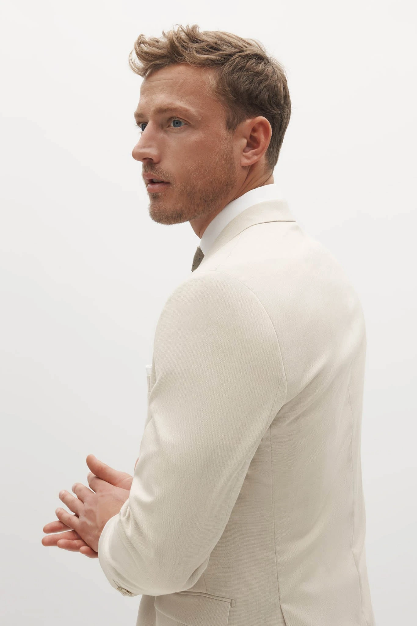 Embody laid-back elegance in the light tan suit. This mod, sandy shade with visible woven texture throughout is designed to suit you from sunny celebrations to the office, candlelit dinners, and everywhere in between. The men’s tan suit is crafted from signature Eco Stretch fabric, sure to keep you cool and comfortable through it all.